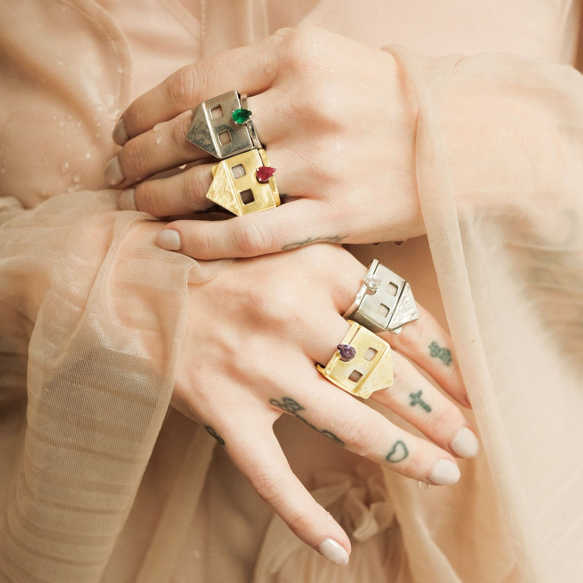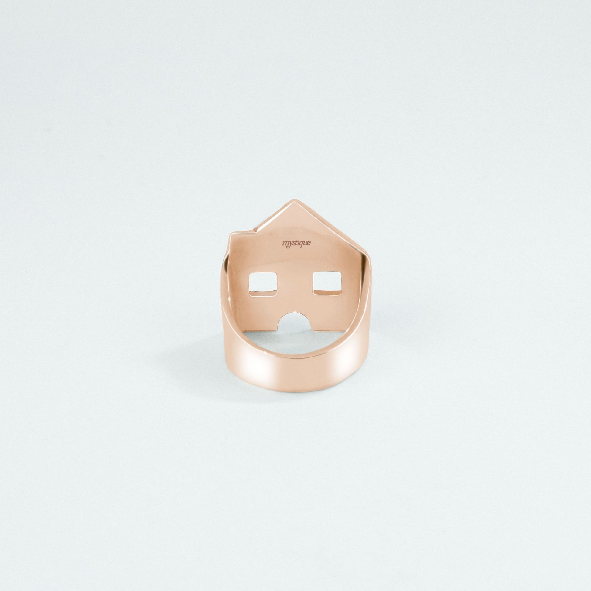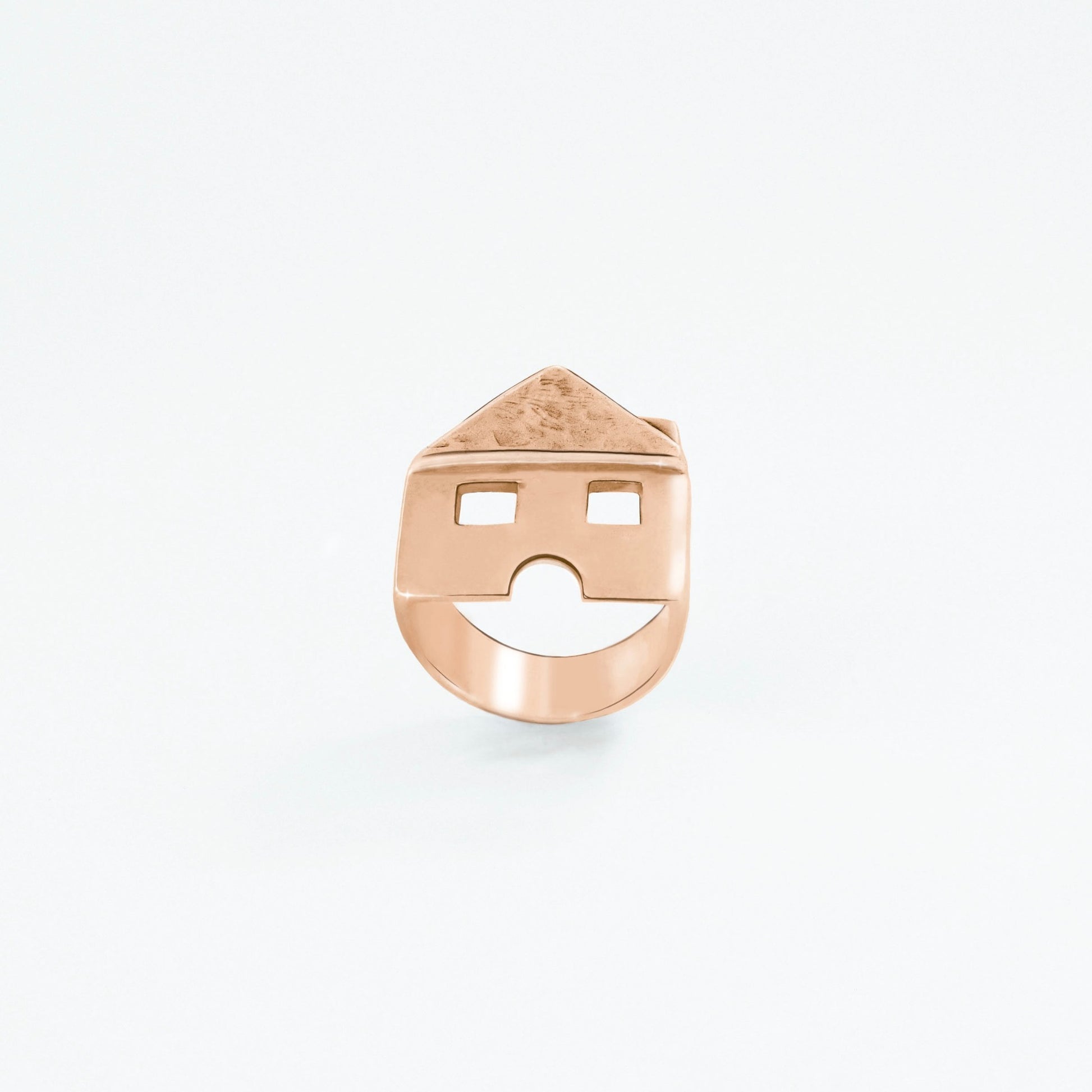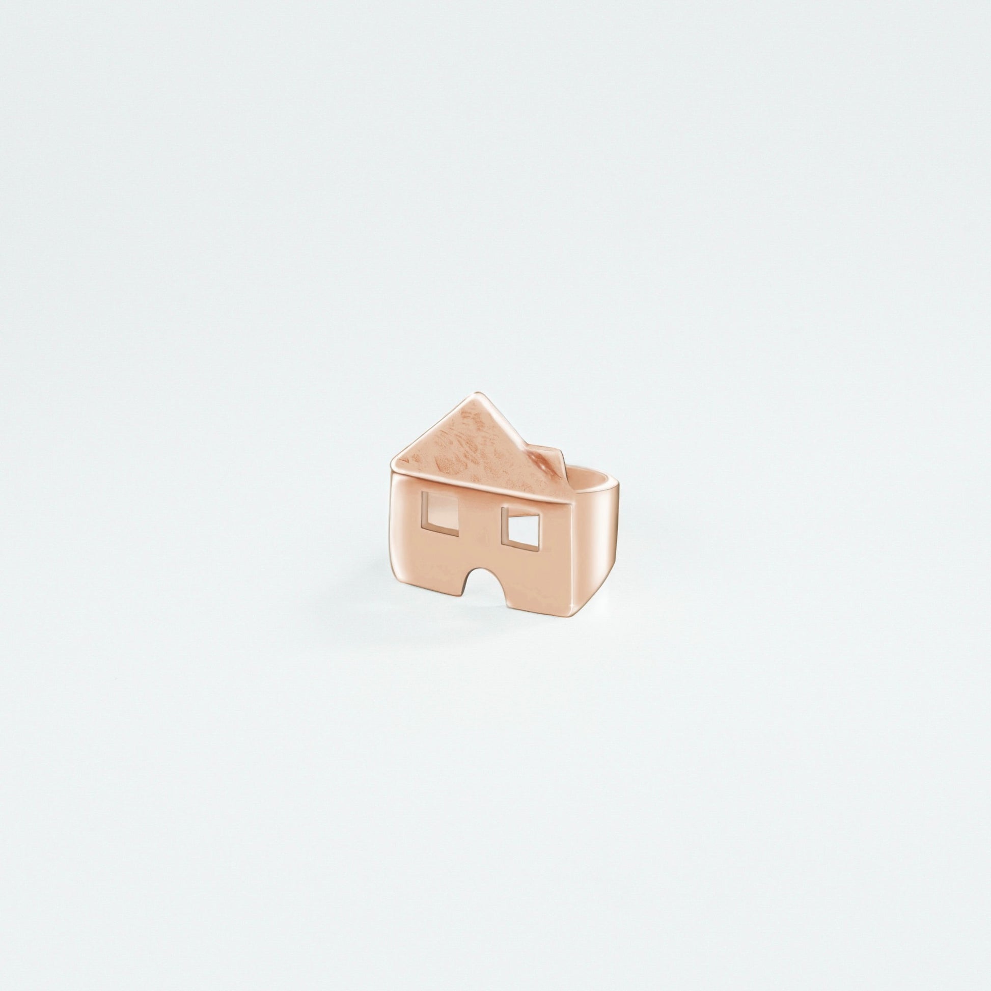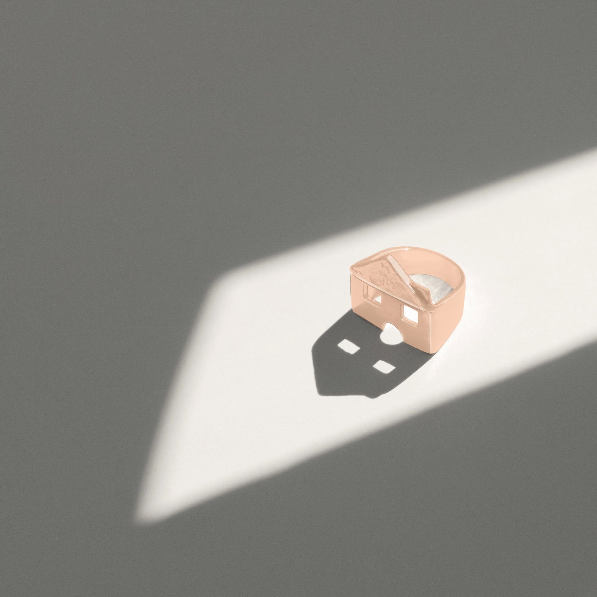 Peça inspirada na ideia de casa como proteção, liberdade e autoconhecimento. O formato vazado remete ao lar e dialoga com o círculo do anel, símbolo de continuidade e eternidade. Resultado: uma pequena escultura para uso diário, leve no toque e marcante na mão.