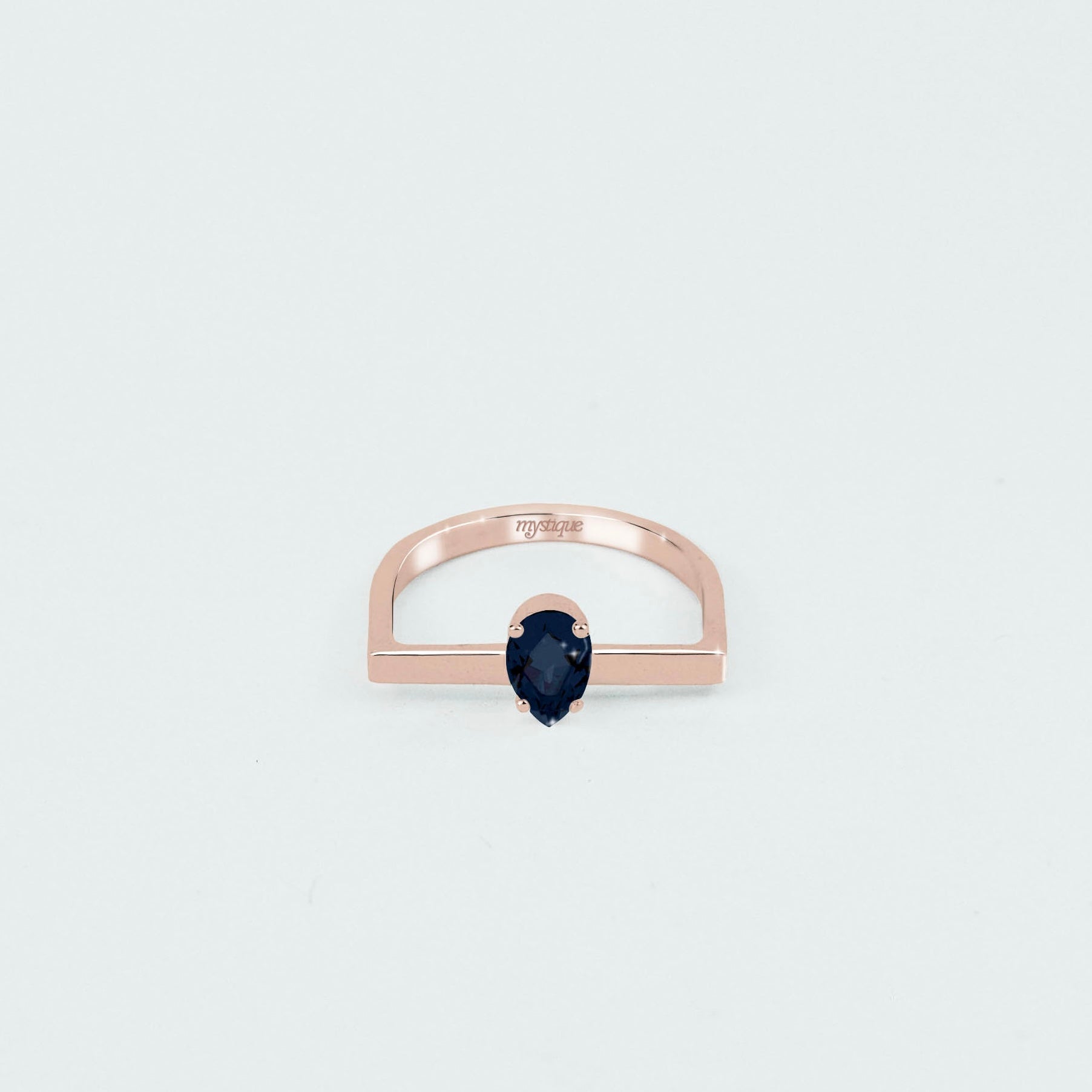 Anel tipo solitário com Safira em lapidação gota. A peça pode ser usada sozinha ou encaixada ao anel Casa, criando um conjunto com volume e contraste. O aro de linhas retas realça a transparência e o brilho da pedra, trazendo um ponto de cor elegante para o dia a dia.