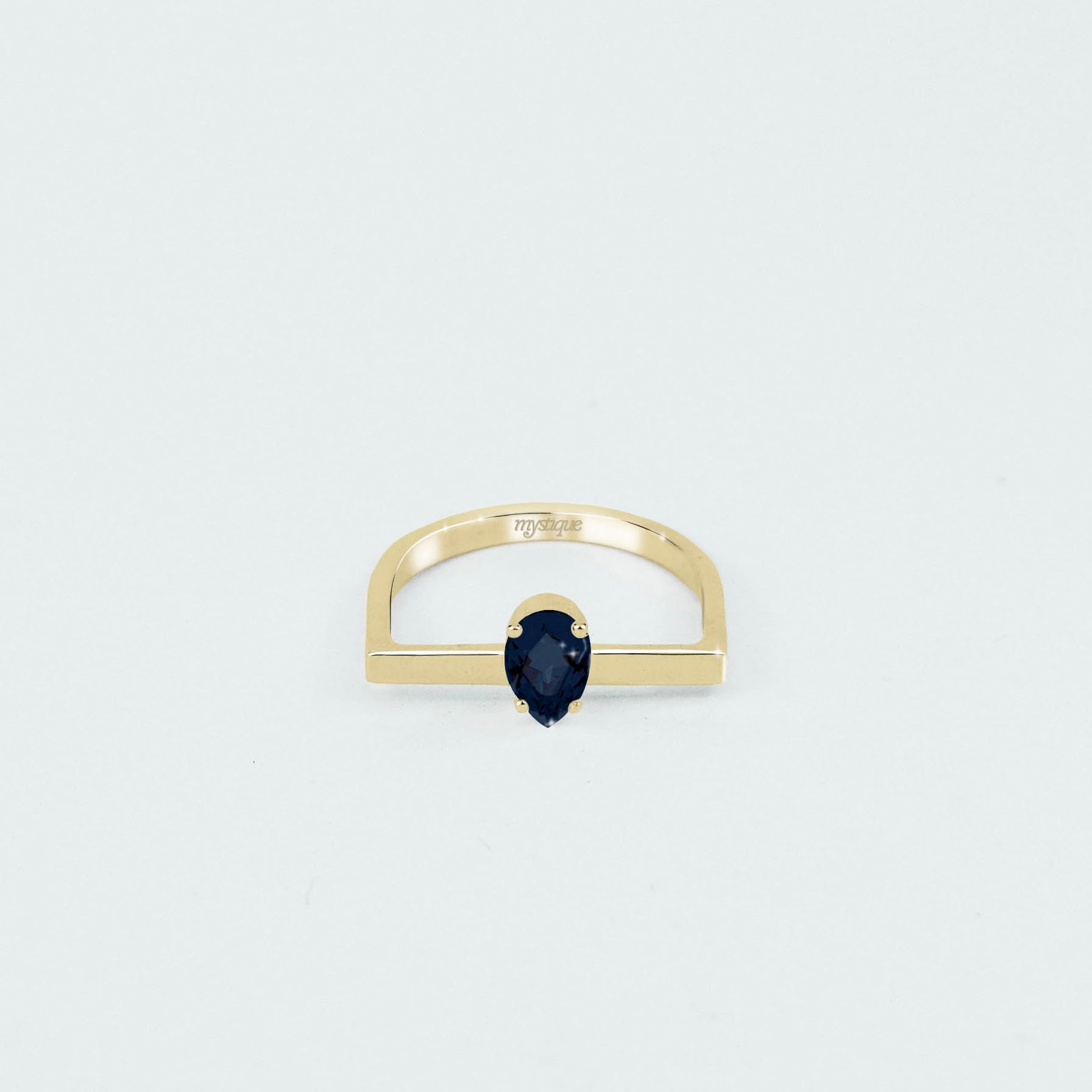 Anel tipo solitário com Safira em lapidação gota. A peça pode ser usada sozinha ou encaixada ao anel Casa, criando um conjunto com volume e contraste. O aro de linhas retas realça a transparência e o brilho da pedra, trazendo um ponto de cor elegante para o dia a dia.