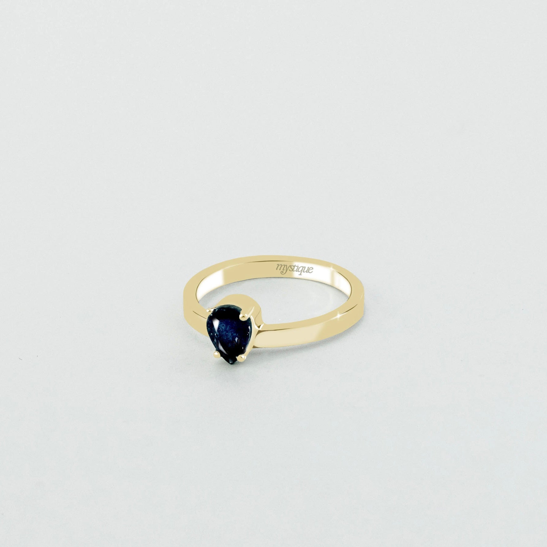 Anel tipo solitário com Safira em lapidação gota. A peça pode ser usada sozinha ou encaixada ao anel Casa, criando um conjunto com volume e contraste. O aro de linhas retas realça a transparência e o brilho da pedra, trazendo um ponto de cor elegante para o dia a dia.