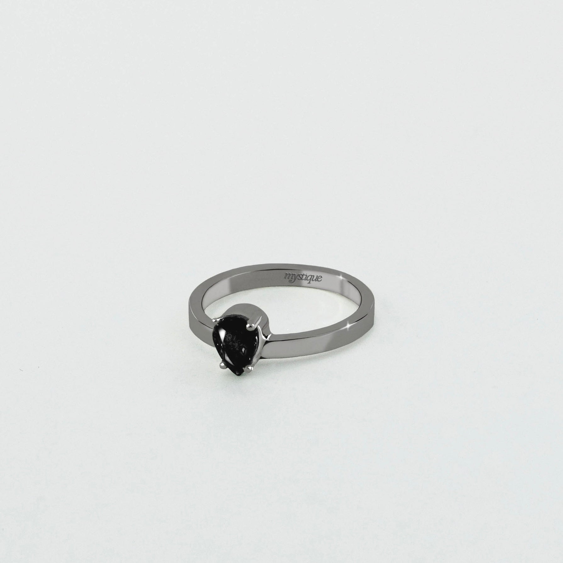 Anel tipo solitário com Ônix em lapidação gota. A peça pode ser usada sozinha ou encaixada ao anel Casa, criando um conjunto com volume e contraste. O aro de linhas retas realça a transparência e o brilho da pedra, trazendo um ponto de cor elegante para o dia a dia.
