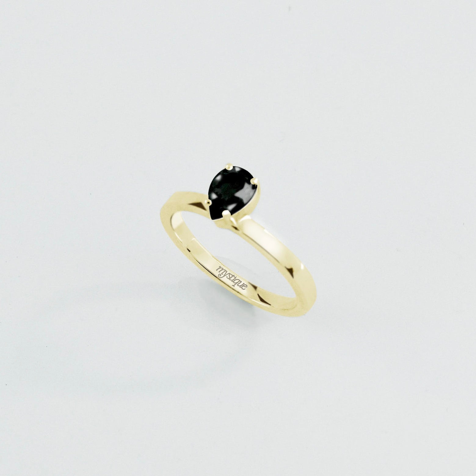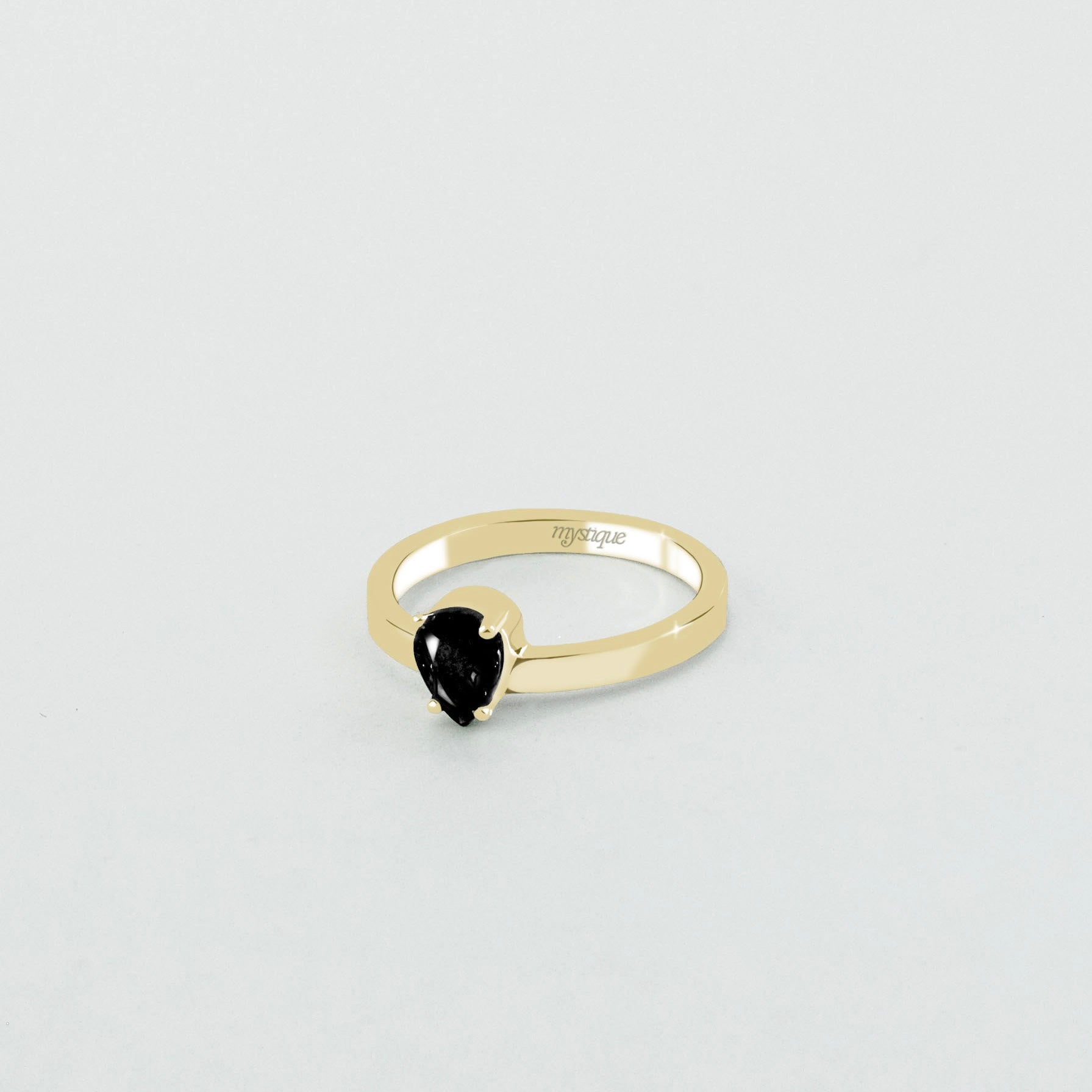 Anel tipo solitário com Ônix em lapidação gota. A peça pode ser usada sozinha ou encaixada ao anel Casa, criando um conjunto com volume e contraste. O aro de linhas retas realça a transparência e o brilho da pedra, trazendo um ponto de cor elegante para o dia a dia.