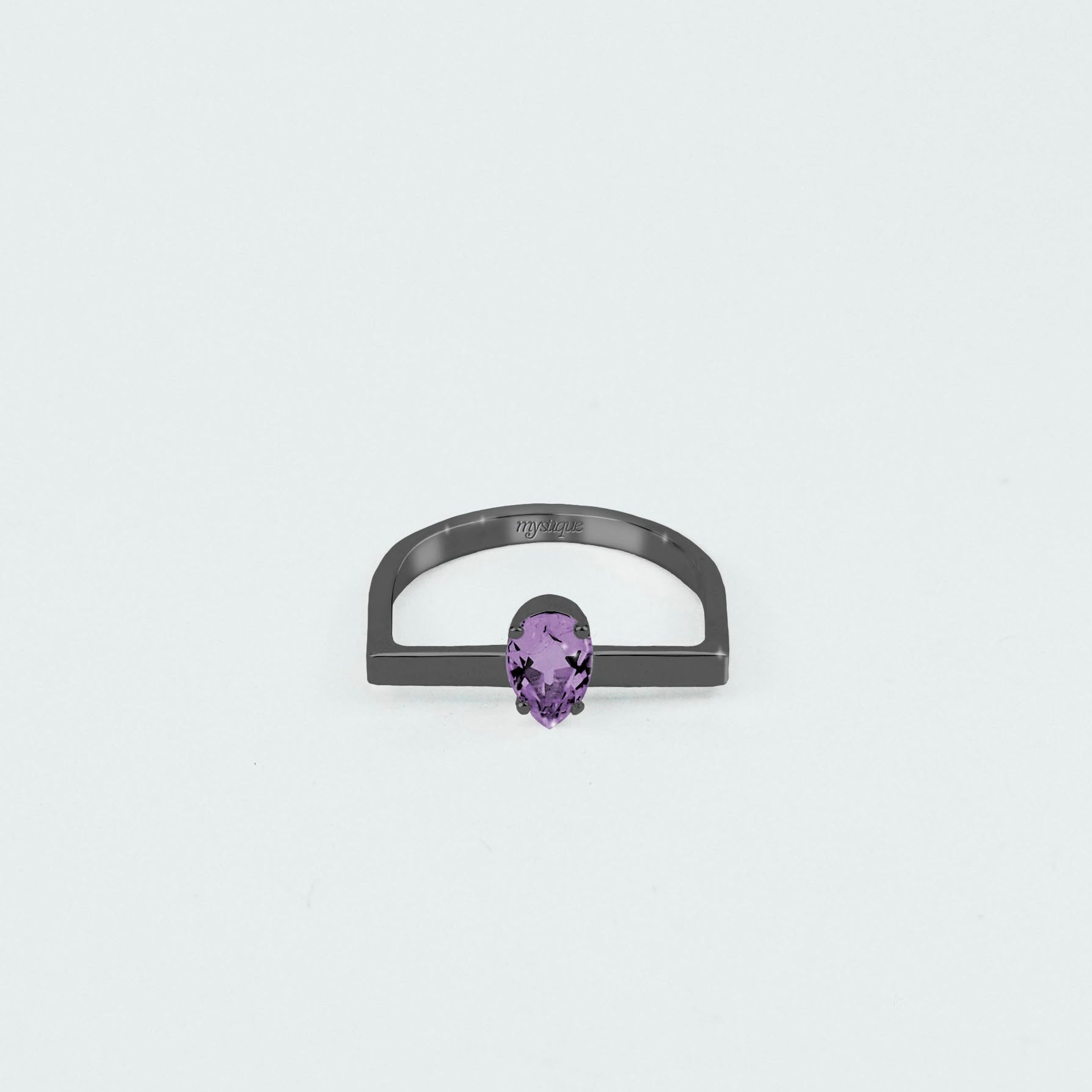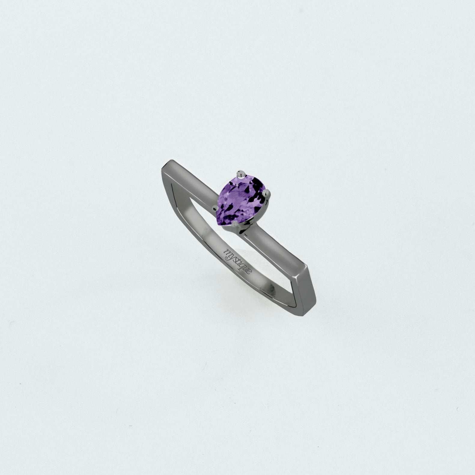 Anel tipo solitário com Ametista em lapidação gota. A peça pode ser usada sozinha ou encaixada ao anel Casa, criando um conjunto com volume e contraste. O aro de linhas retas realça a transparência e o brilho da pedra, trazendo um ponto de cor elegante para o dia a dia.
