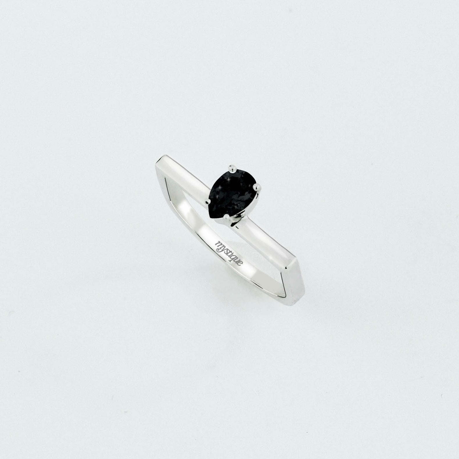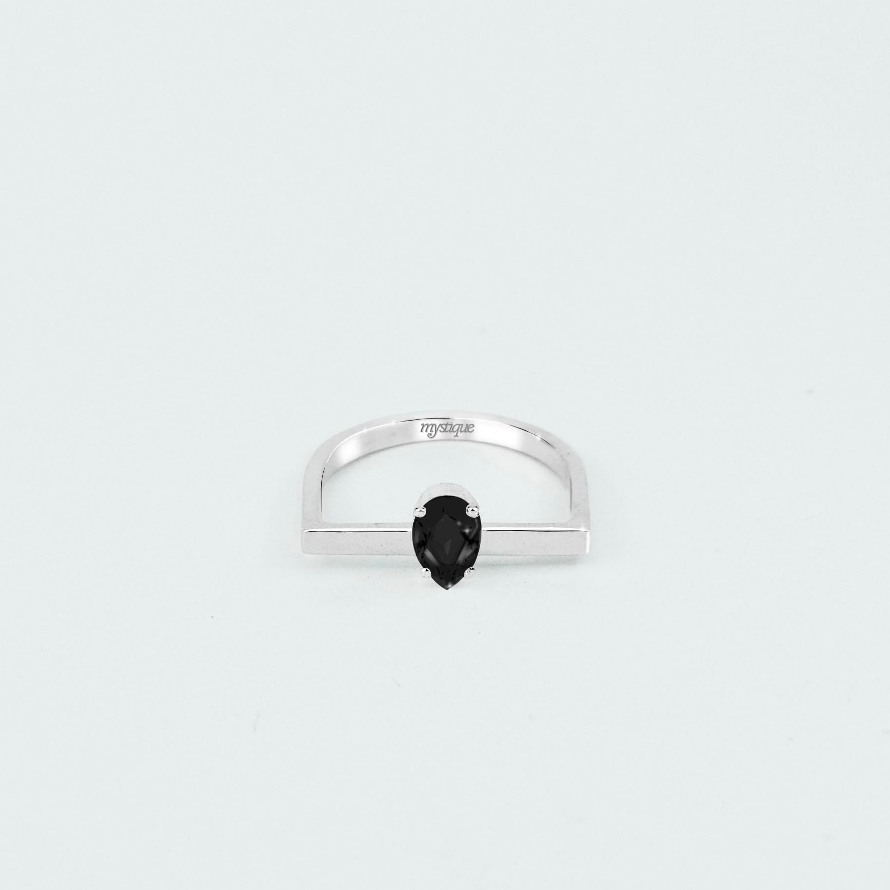 Anel tipo solitário com Ônix em lapidação gota. A peça pode ser usada sozinha ou encaixada ao anel Casa, criando um conjunto com volume e contraste. O aro de linhas retas realça a transparência e o brilho da pedra, trazendo um ponto de cor elegante para o dia a dia.