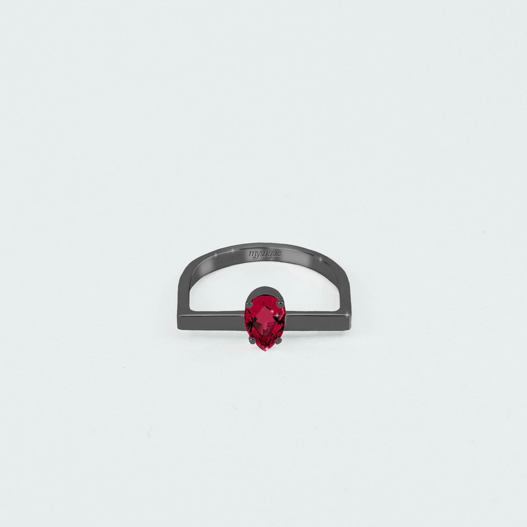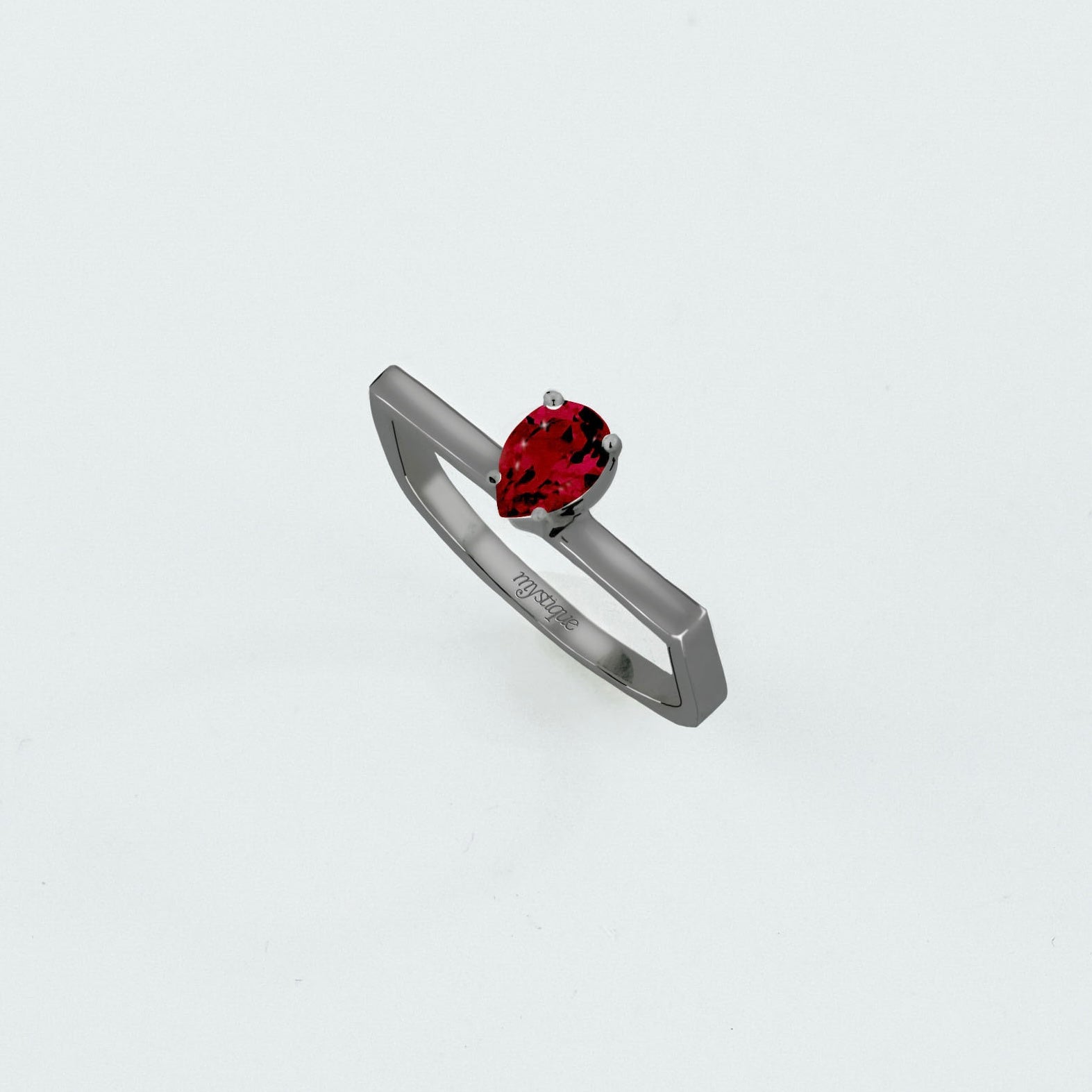 Anel tipo solitário com Rubi em lapidação gota. A peça pode ser usada sozinha ou encaixada ao anel Casa, criando um conjunto com volume e contraste. O aro de linhas retas realça a transparência e o brilho da pedra, trazendo um ponto de cor elegante para o dia a dia.