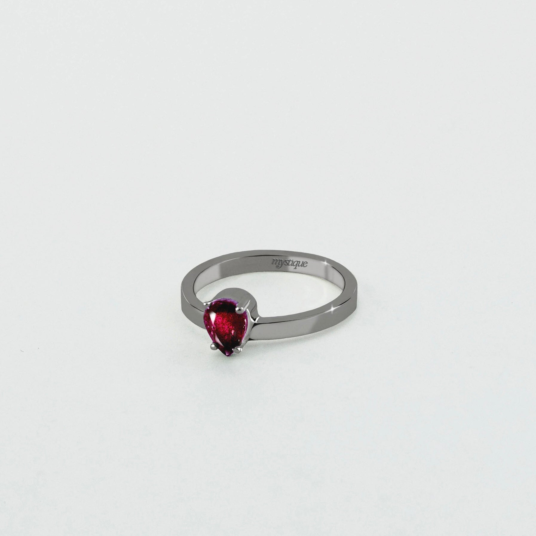 Anel tipo solitário com Rubi em lapidação gota. A peça pode ser usada sozinha ou encaixada ao anel Casa, criando um conjunto com volume e contraste. O aro de linhas retas realça a transparência e o brilho da pedra, trazendo um ponto de cor elegante para o dia a dia.