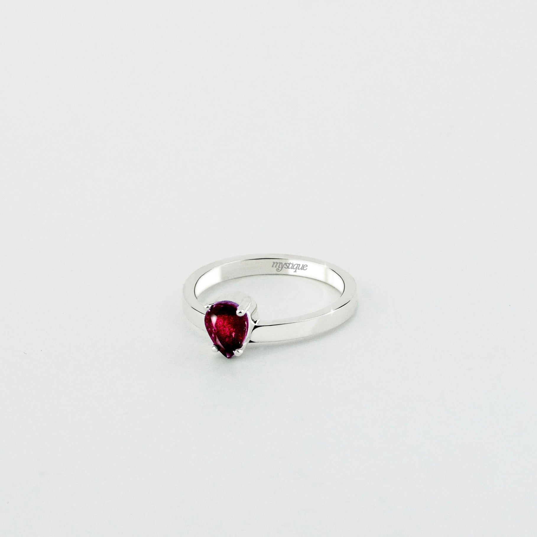 Anel tipo solitário com Rubi em lapidação gota. A peça pode ser usada sozinha ou encaixada ao anel Casa, criando um conjunto com volume e contraste. O aro de linhas retas realça a transparência e o brilho da pedra, trazendo um ponto de cor elegante para o dia a dia.